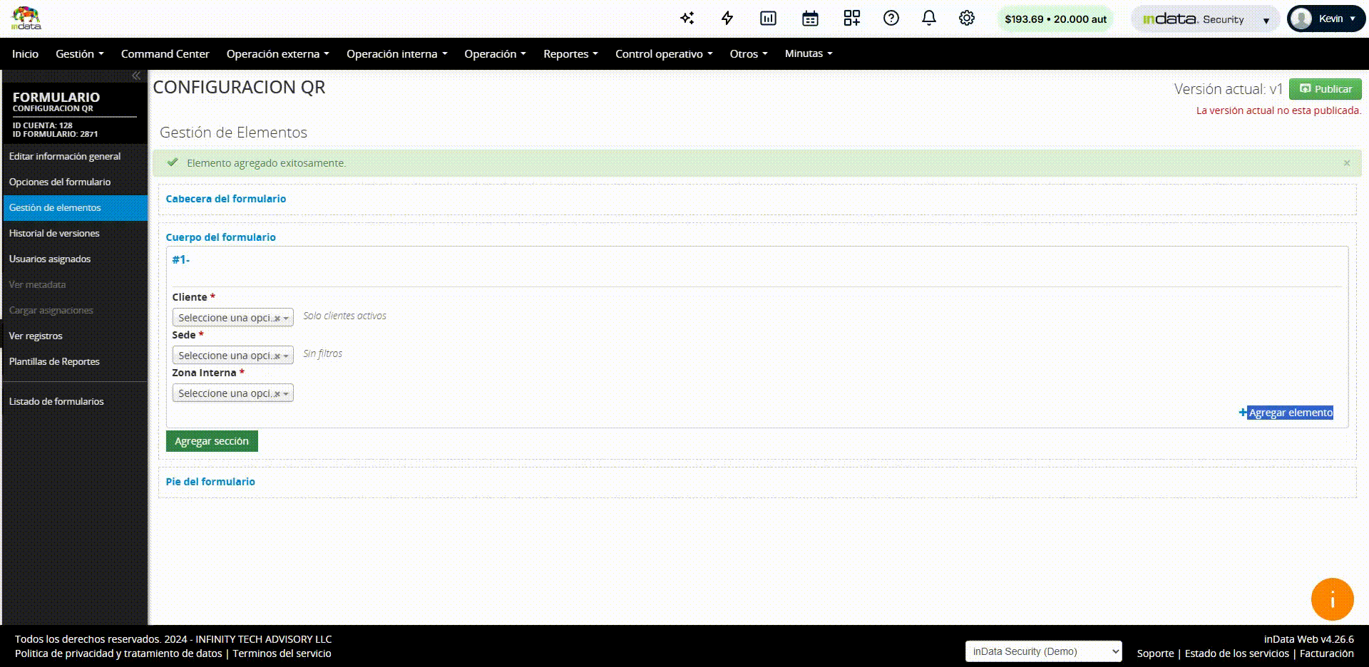 4. En Agregar elemento, seleccione los siguientes elementos: Cliente, Sede/Sucursal y Zona Interna, y márquelos como requeridos. No olvide guardar cada elemento, una vez creado.