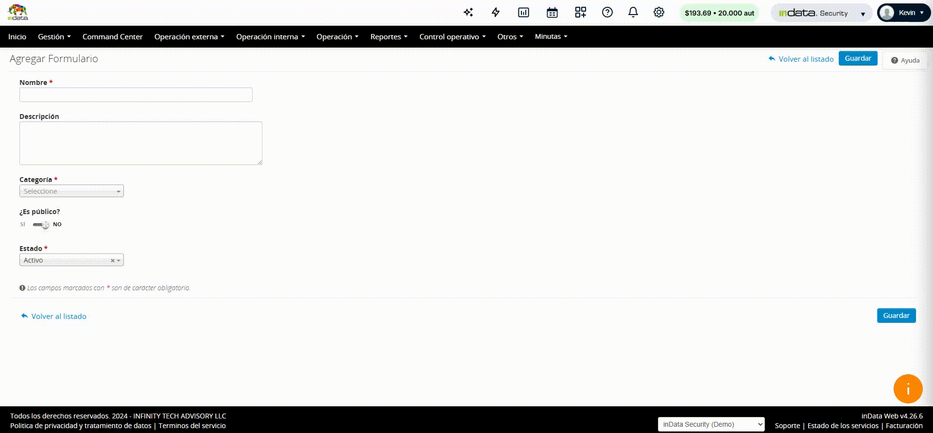 2. Digite el nombre, seleccione la categoría y seleccione si el formulario es publico o no, y finalice con guardar.
