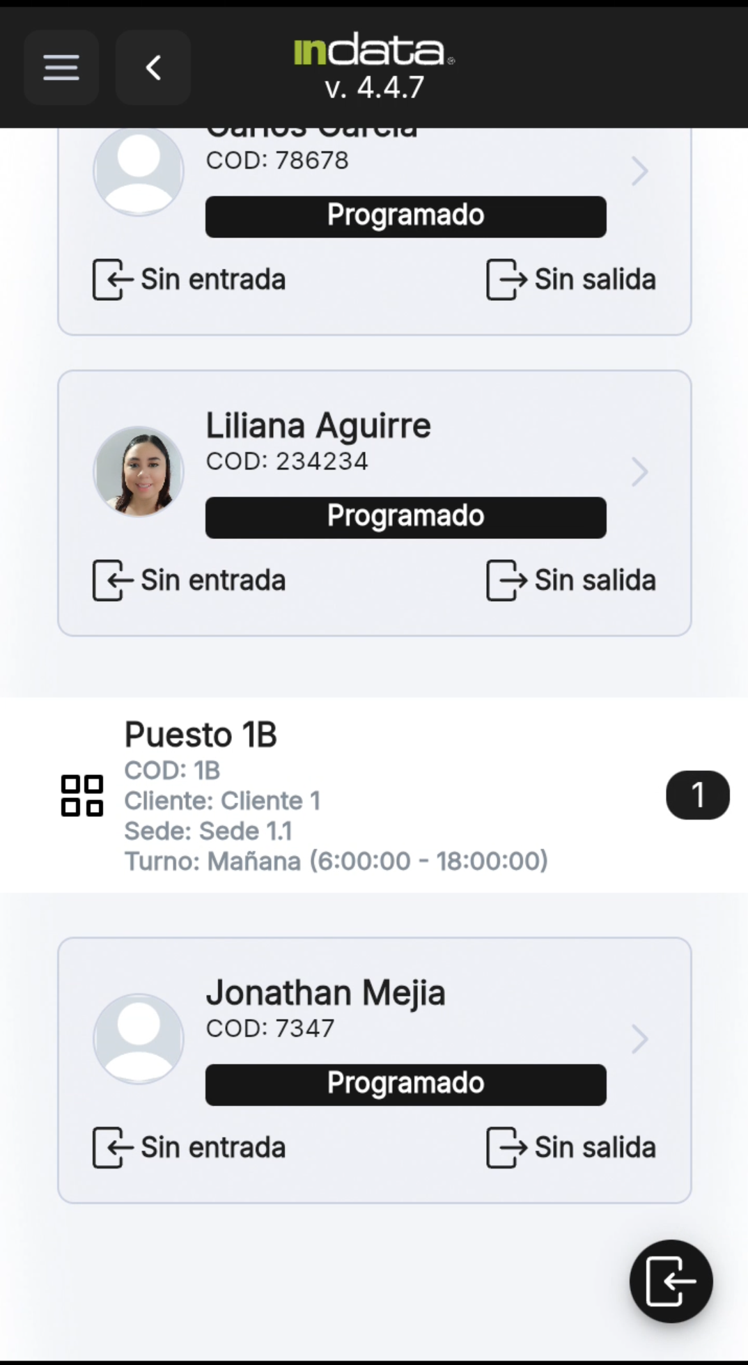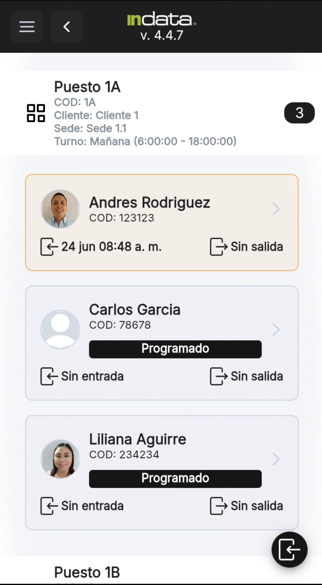 inData mostrará automáticamente los puestos operativos programados para la sede asociada al dispositivo, teniendo en cuenta la fecha y el rango horario actual.