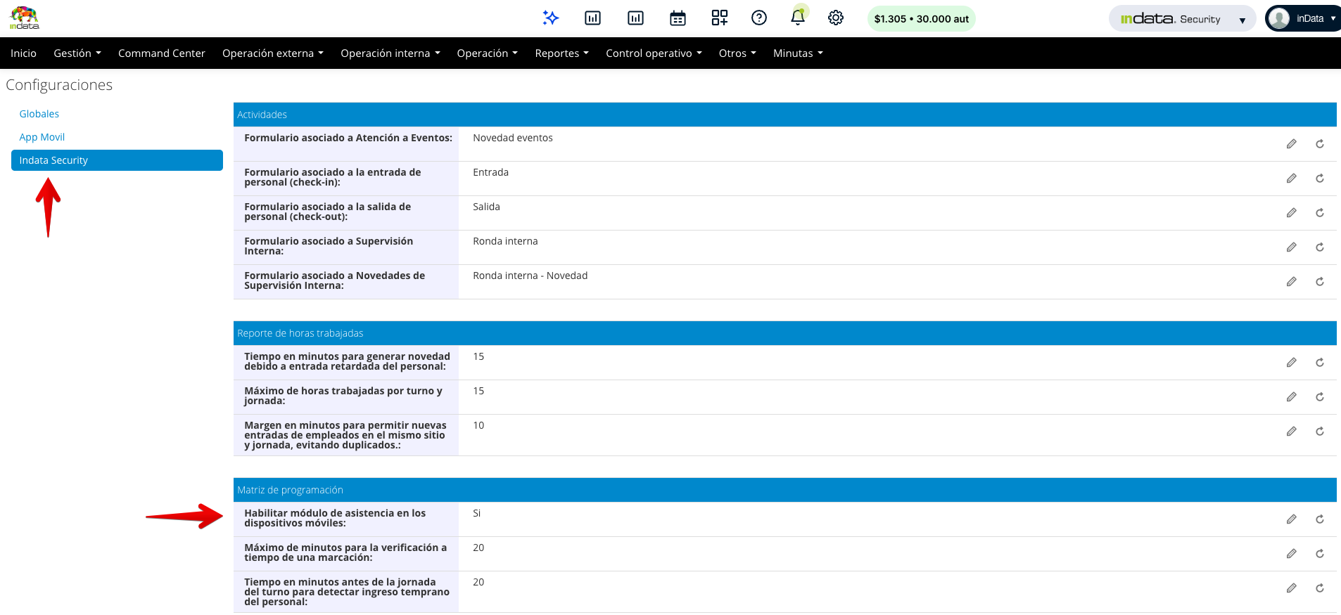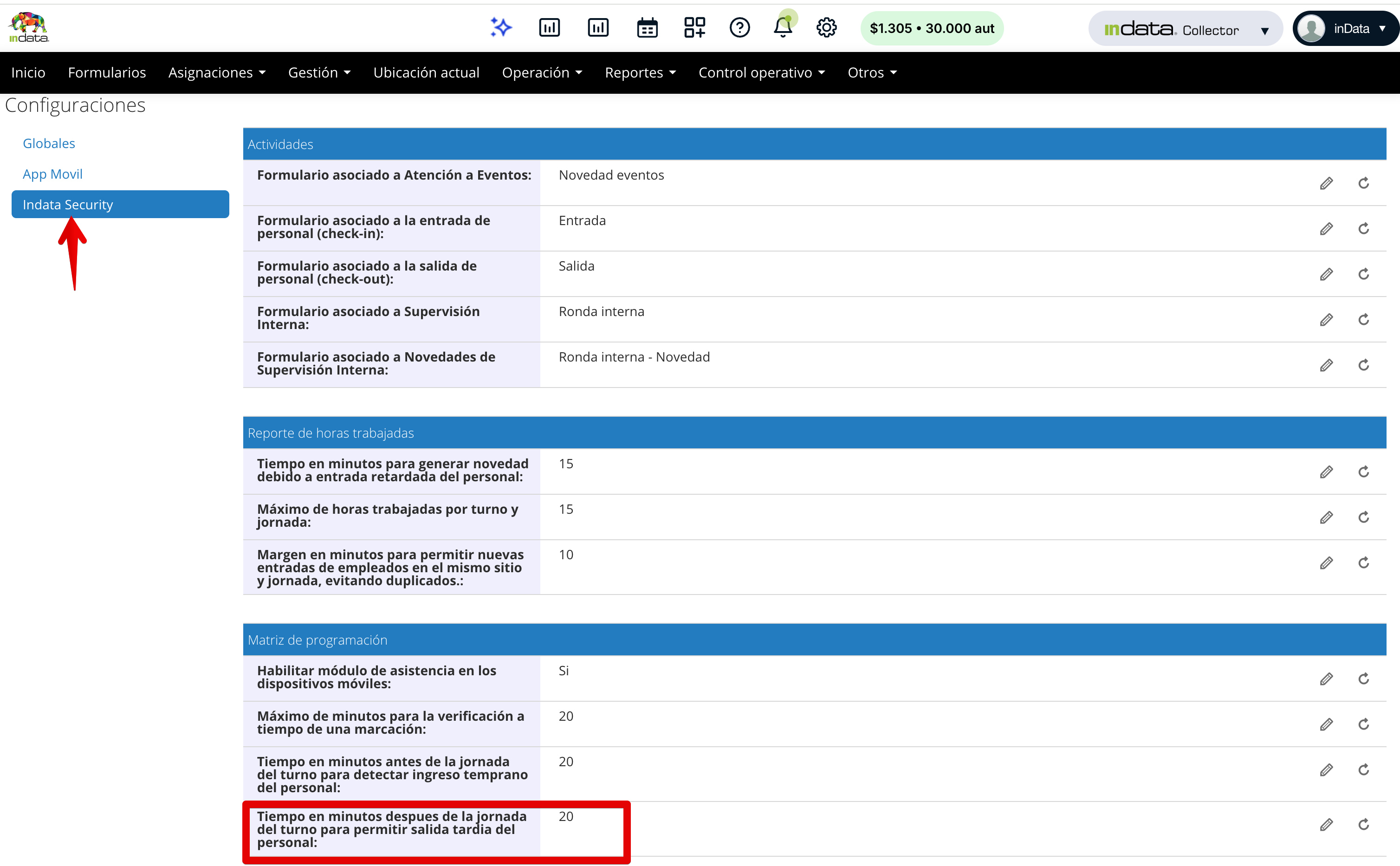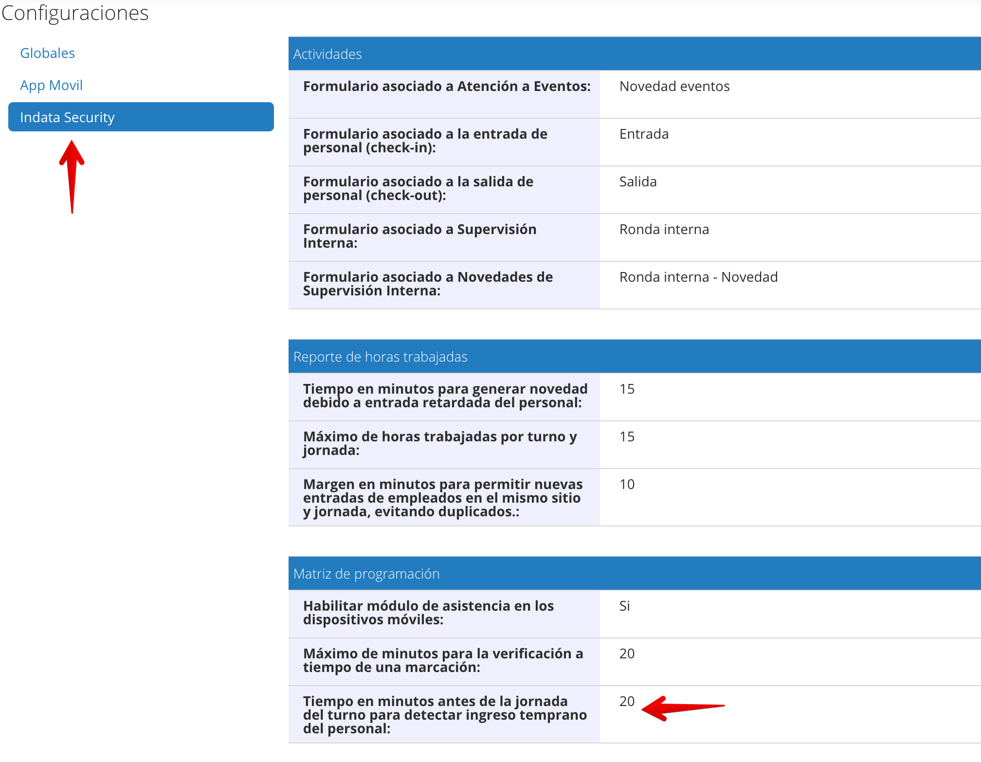 El módulo de Registro de asistencia permite visualizar, desde inData Móvil, la programación de puestos operativos en función del turno actual según la hora y dia. Para ello, tiene en cuenta el parámetro: “Tiempo en minutos antes de la jornada del turno para detectar ingreso temprano del personal”. (Ver pantallazo de referencia)