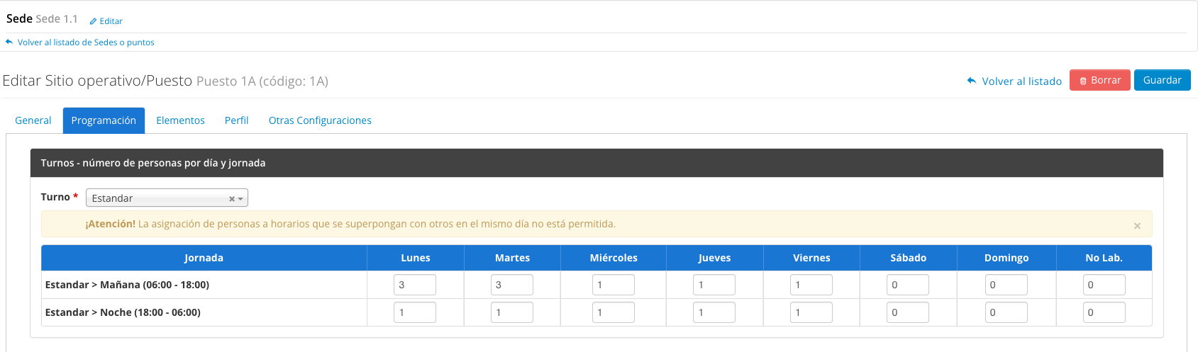 El día de la semana, rango horario y cupo de personal operativo del puesto aplican según la configuración establecida.