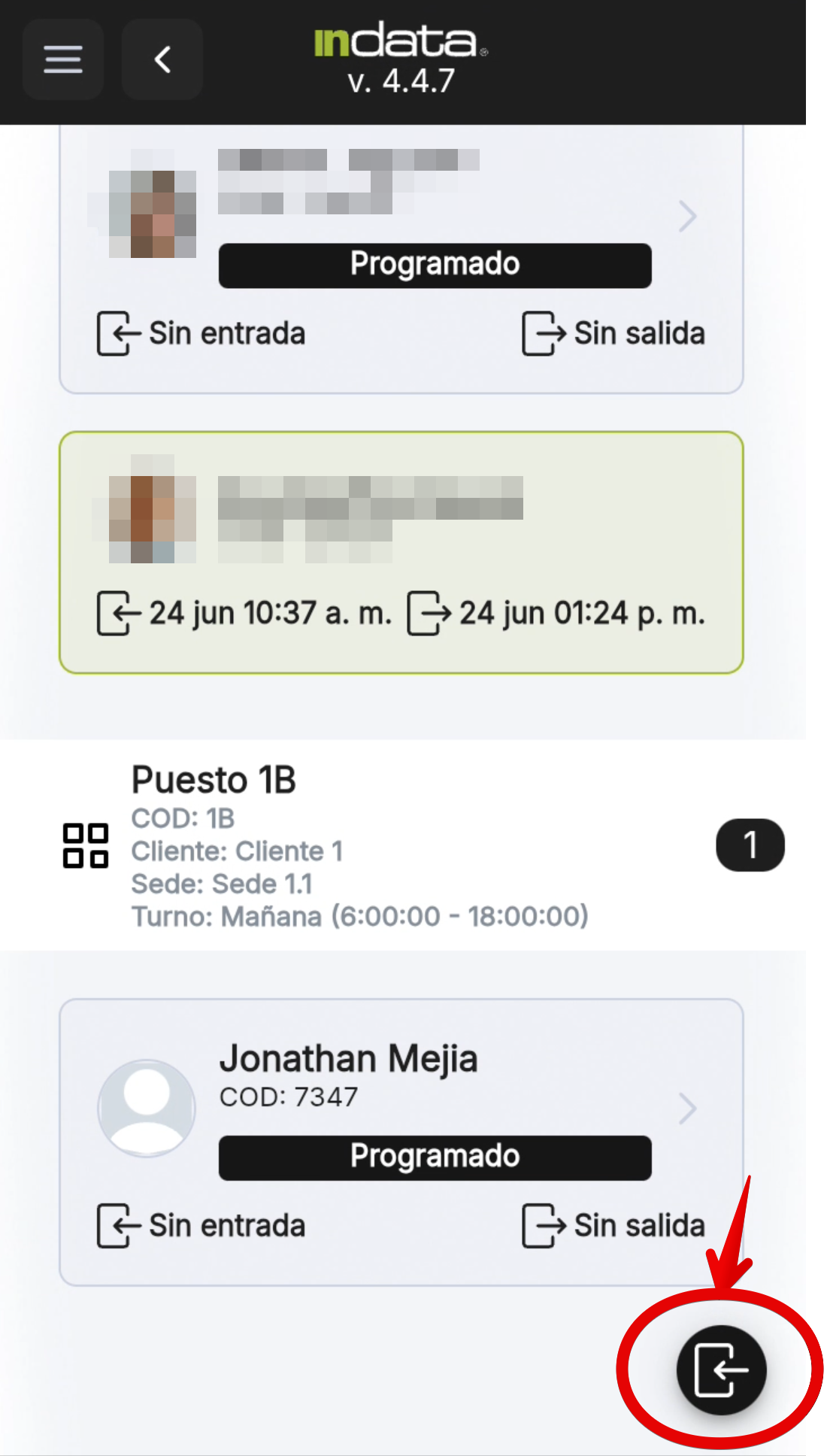 · Para marcar una entrada o salida, el usuario simplemente debe seleccionarse en el listado. inData solicitará una verificación biométrica (con prueba de vida). Si la identidad coincide con el usuario seleccionado, se habilitará la opción correspondiente según el estado actual (entrada o salida).