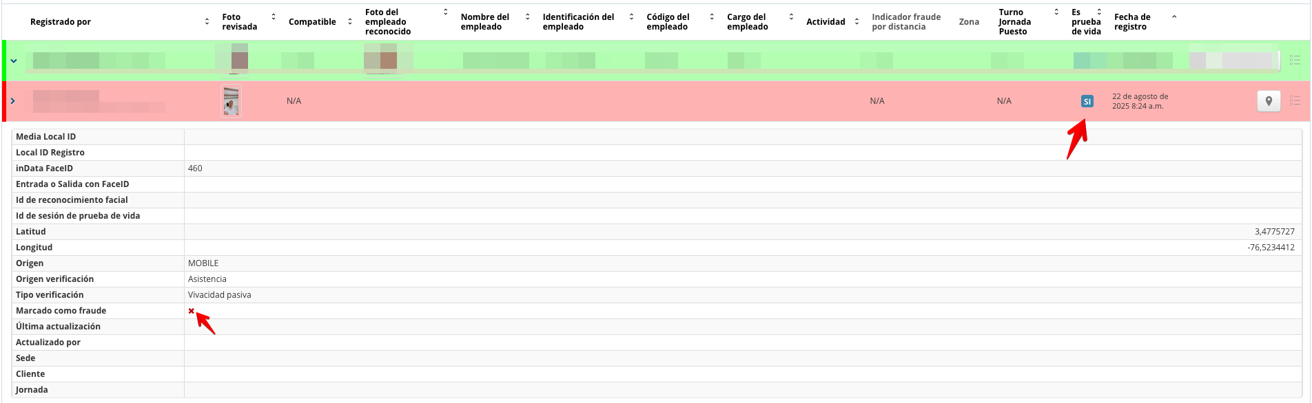 - En el campo Marcado como fraude (nuevo) se señala si la validación biométrica fue considerada fraude. En este caso, la “X” indica que no hubo fraude.