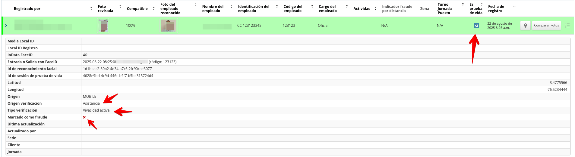 - En la columna Prueba de vida aparece “Sí”, lo que significa que se realizó una verificación de vivacidad y no solamente un reconocimiento facial.